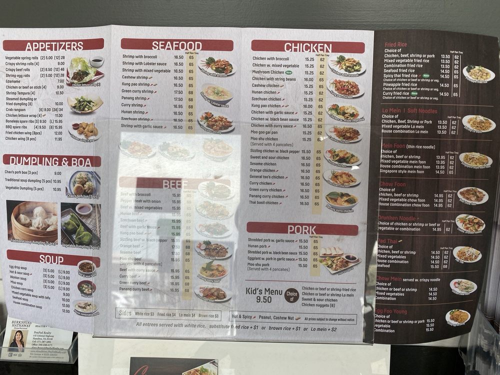 Chau's Cafe in Ashburn, VA offers a diverse Chinese menu with options for vegan and vegetarian diners. The appetizers range from crispy spring rolls to flavorful dumplings. Their soup selection includes classics like Hot and Sour Soup and Egg Drop Soup. Customers praise the unique dishes and quality of the food, with highlights like the Drunken Noodles and upcoming Xiao Long Bao. The cozy atmosphere and friendly service enhance the dining experience. Chau's Cafe is a must-visit for those craving authentic Chinese cuisine with a modern twist.